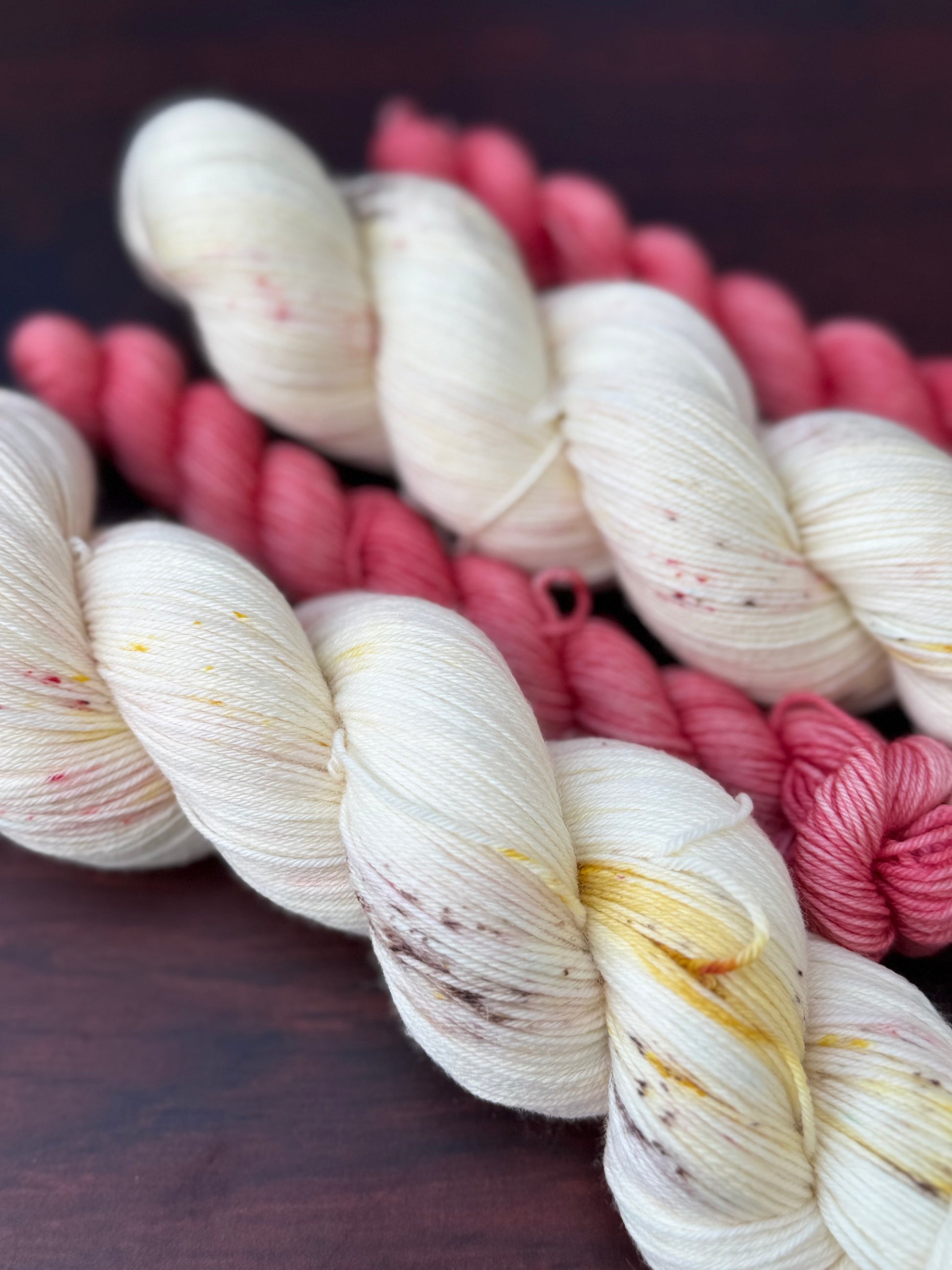 "Hot Fudge Sundae" is a blend of red, yellow, and brown speckles on a creamy white base. It includes a 20g mini in a pretty cherry red. The dyes were set and then washed and rinsed to remove any remaining dye. Minimal bleeding may occur, so I recommend hand washing projects separately in cold water and laying flat to dry. Please be aware that colors on your screen may not exactly match the colors in real life.