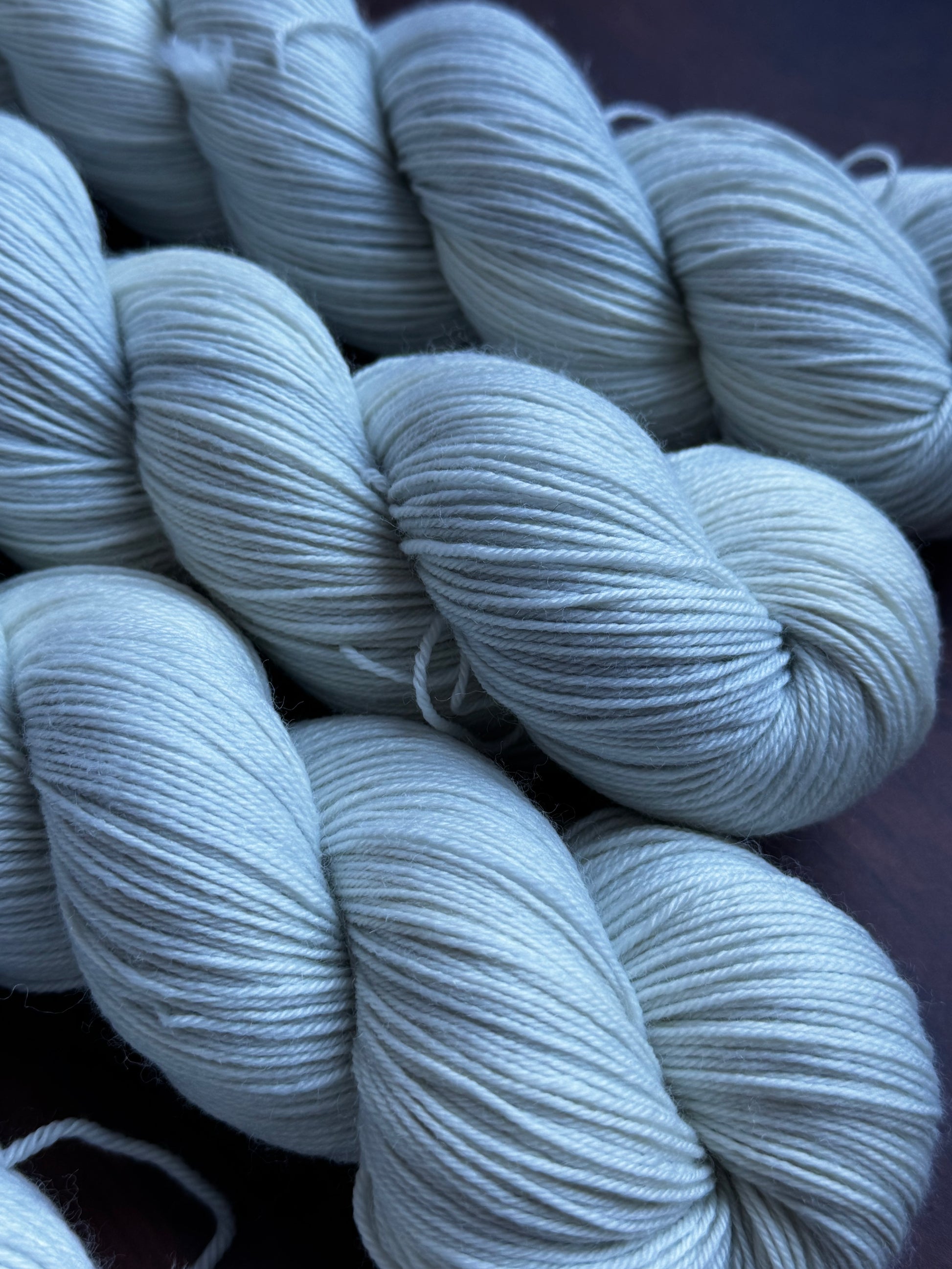 The colorway is "Snow Flurry": it is a neutral very light gray tonal yarn. The dyes were set and then washed and rinsed to remove any remaining dye. Minimal bleeding may occur, so I recommend hand washing projects separately in cold water and laying flat to dry. Please be aware that colors on your screen may not exactly match the colors in real life.